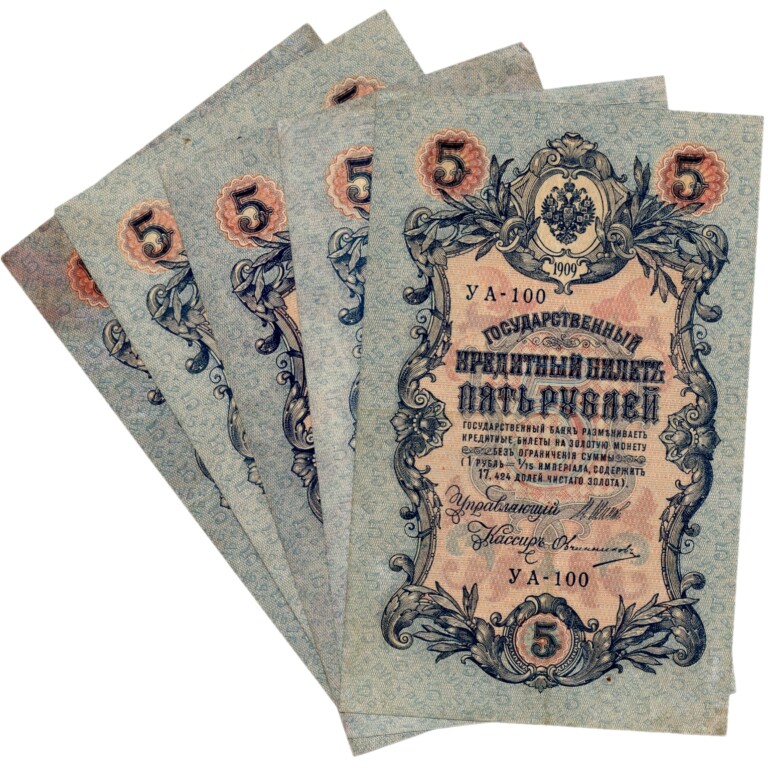 Lot 5 ks 5 rubl 1909, stavy hezké -1 až 2