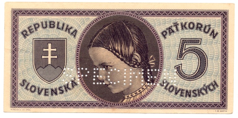 5 Koruna 1945, s.D026, perforovaná SPECIMEN dole, stav 0