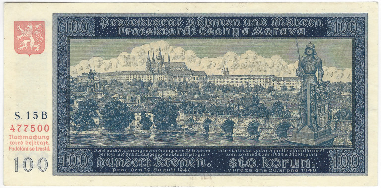 100 Koruna 1940, série 15 B, I. vydání, neperforovaná, stav