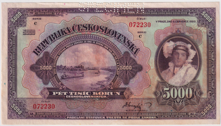 5000 Koruna 1920, s.C, posunutá perforace, stav 0-, fleky