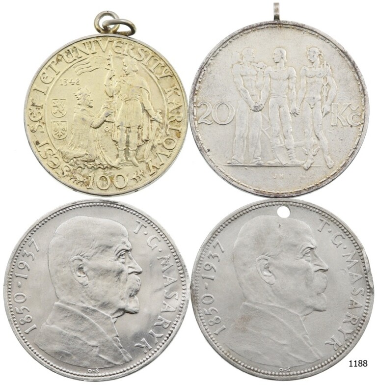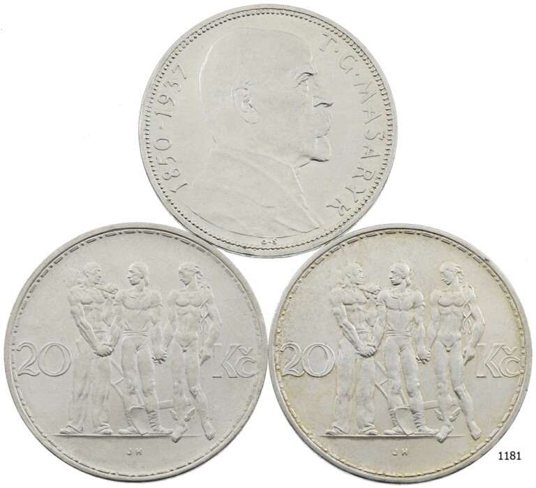 Lot 3 ks AR mincí 20 koruna 1934 a 1937 TGM, stav -0 až 1