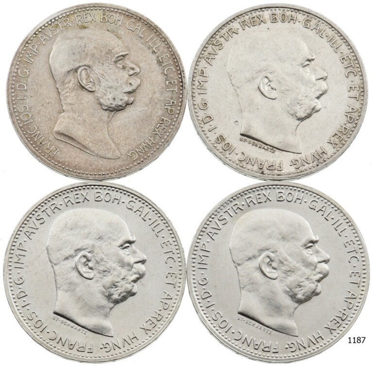 Lot 4 ks 1 Koruna 1908 jub., 1913, 1914, 1915, stav -0 až 1