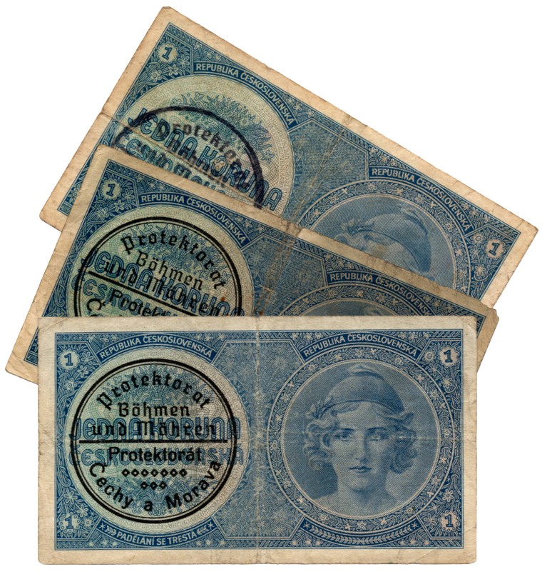 Lot 3 ks 1 Koruna b.l. (1938/1940), strojové a ruční razítko
