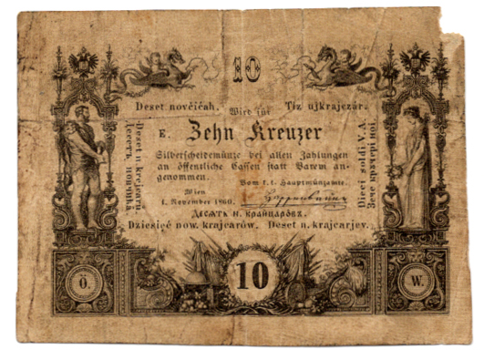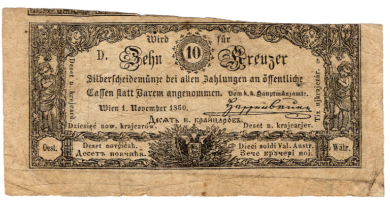 Vídeň , 10 Krejcar, 1860, peněžní poukázka pro české země, stav