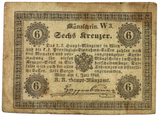 Vídeň , 6 Krejcar, 1849, peněžní poukázka pro české země, stav