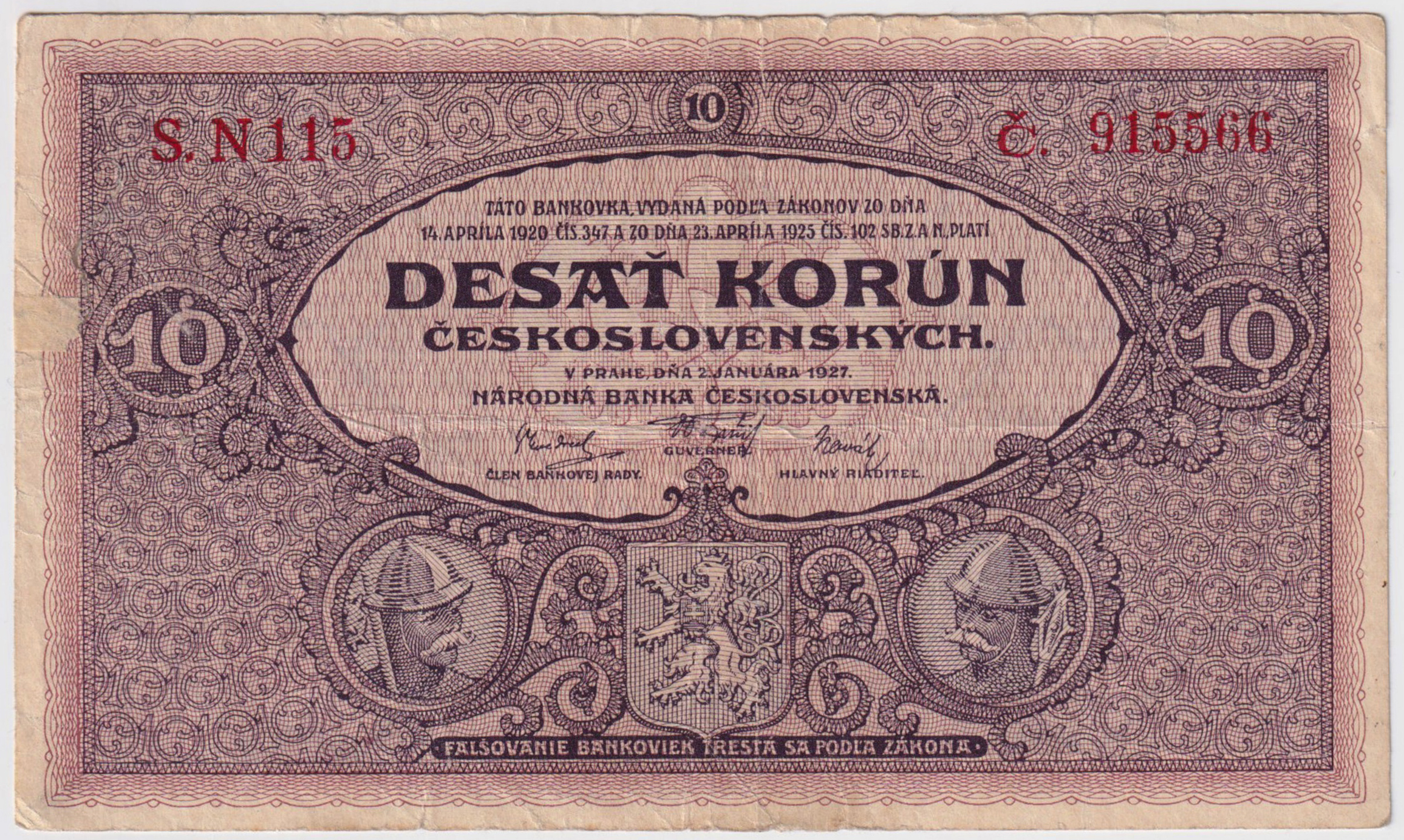10 Koruna 1927, s.N 115, neperforovaná, stav 2