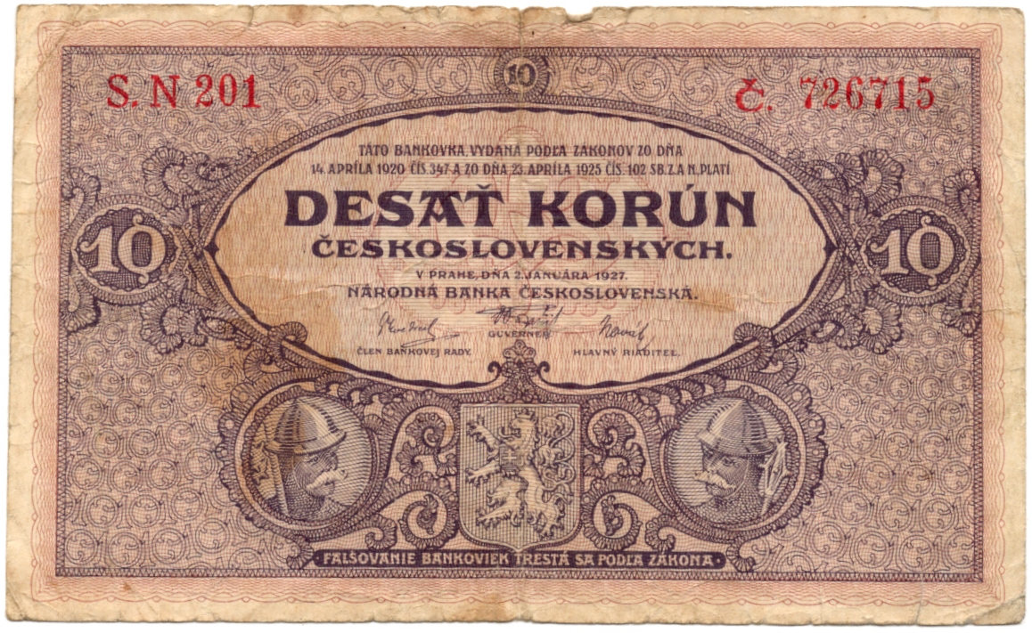 10 Koruna 1927, s.N 201, neperforovaná, stav 3-