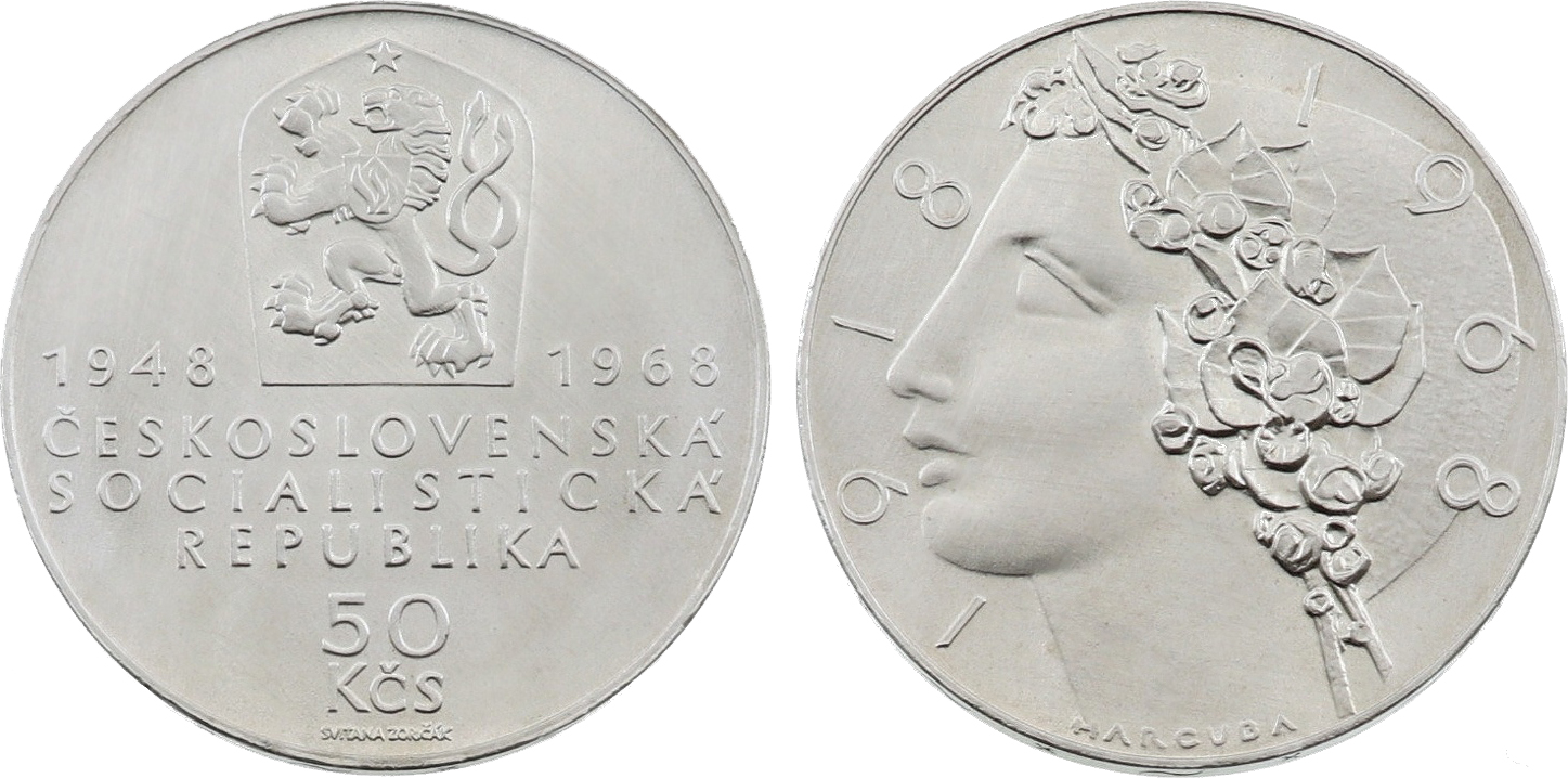 50 Koruna 1968 – 50. výročí vzniku Československa a 20. výročí vítězství pracujícího lidu, stav lehce čištěná