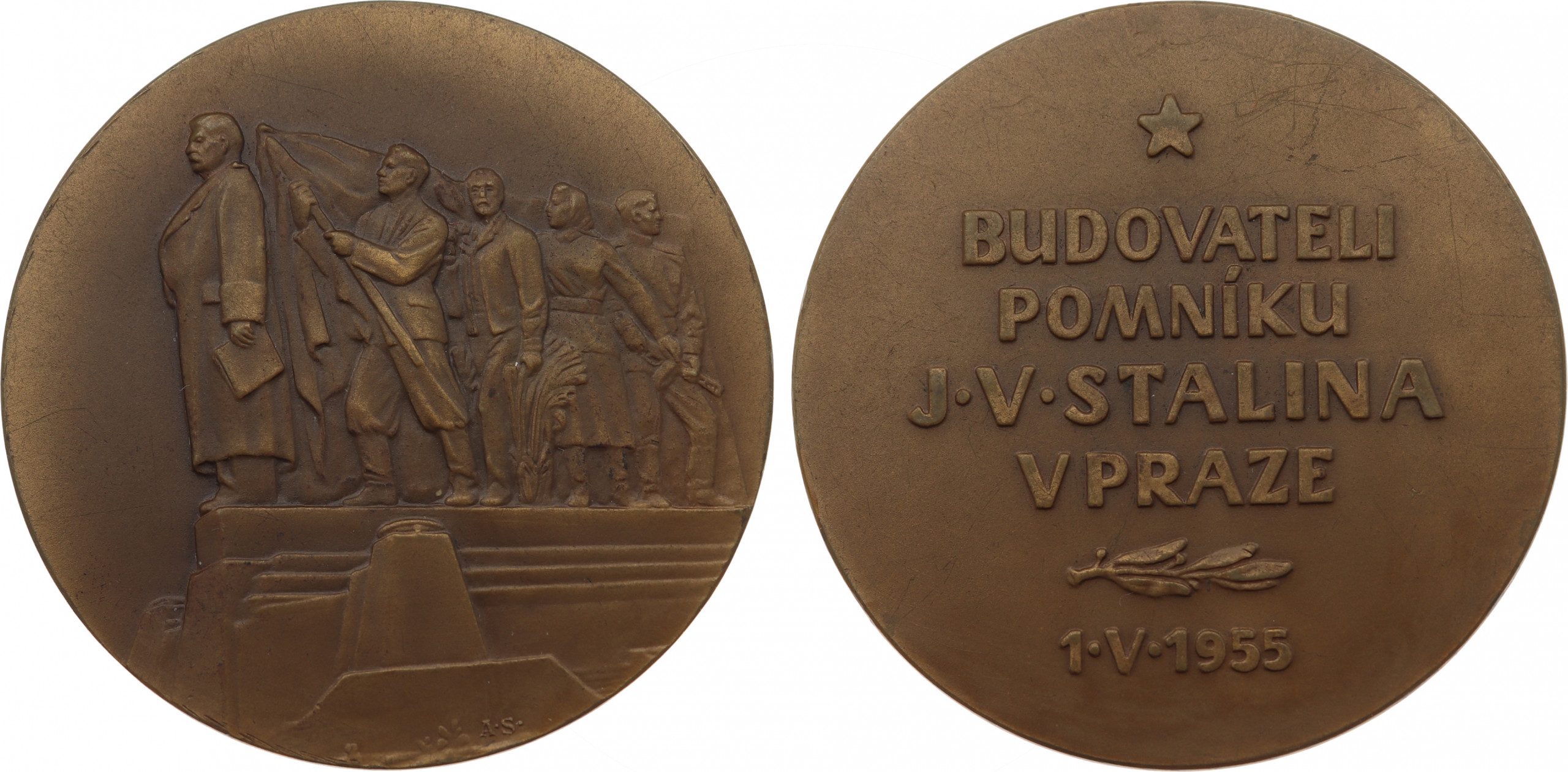 AE Medaile 1955 – Budovateli pomníku J. V. Stalina v Praze 1.V.1955, medaile udělovaná jenom pro lidi, kteří se podíleli na stavbě pomníku, „RR“ vzácná, Br 60 mm (73,53 g), stav 0/0, původní etue