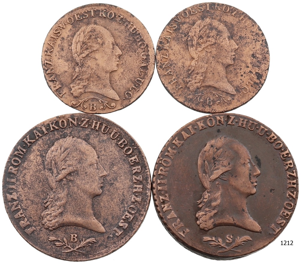 Lot 4 ks AE mincí 1 krejcar 1812 B, 6 krejcar 1800 B,S, stav -1, oxidace