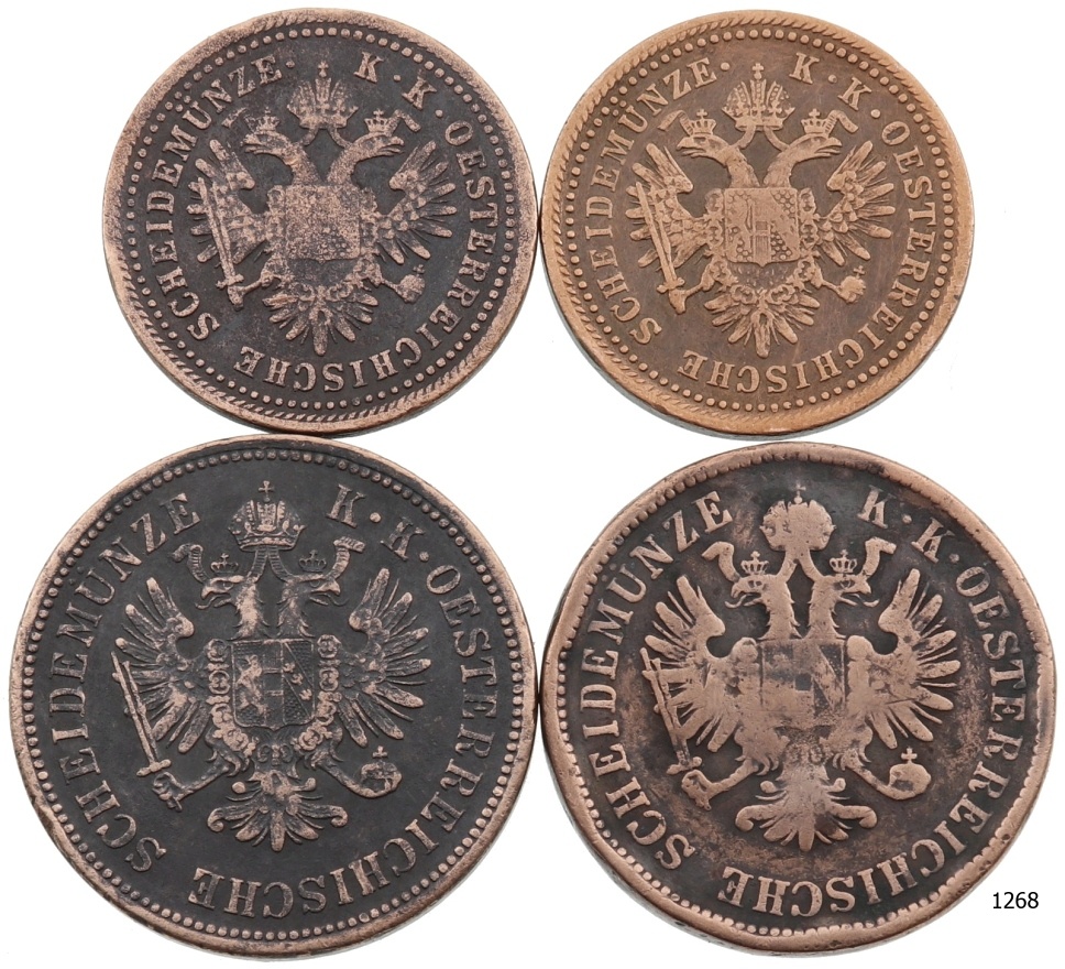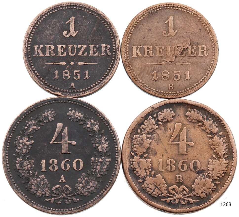 Lot 4 ks AE mincí 1 a 4 krejcar 1851 – 1860, stav 2 až 3