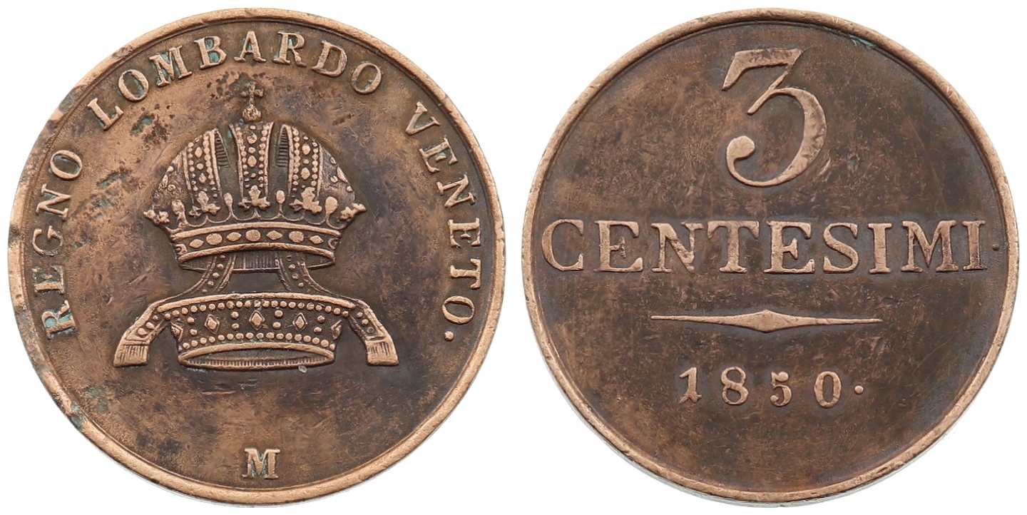 3 Centesimi 1850 M, stav 1/1, „R“