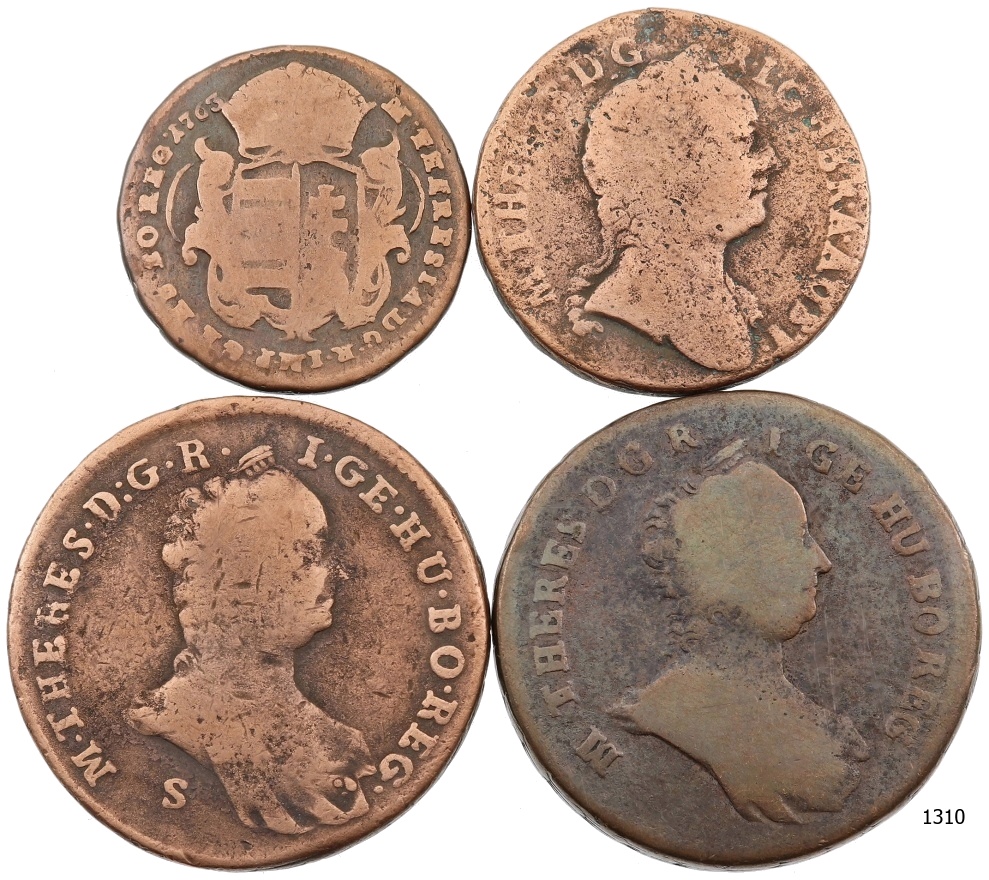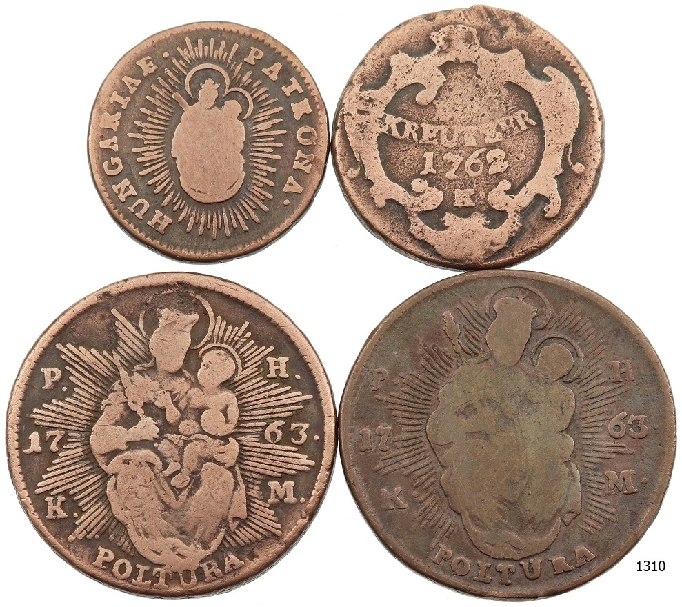 Lot 4 ks AE mincí, Denár 1763, 1 Krejcar 1762 K, Poltura 1763 KM, stav 3