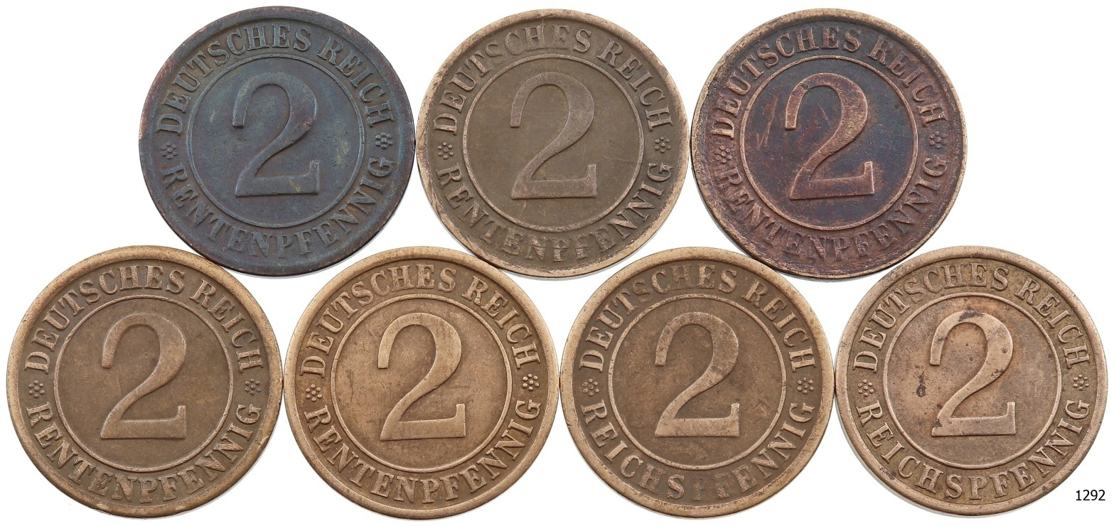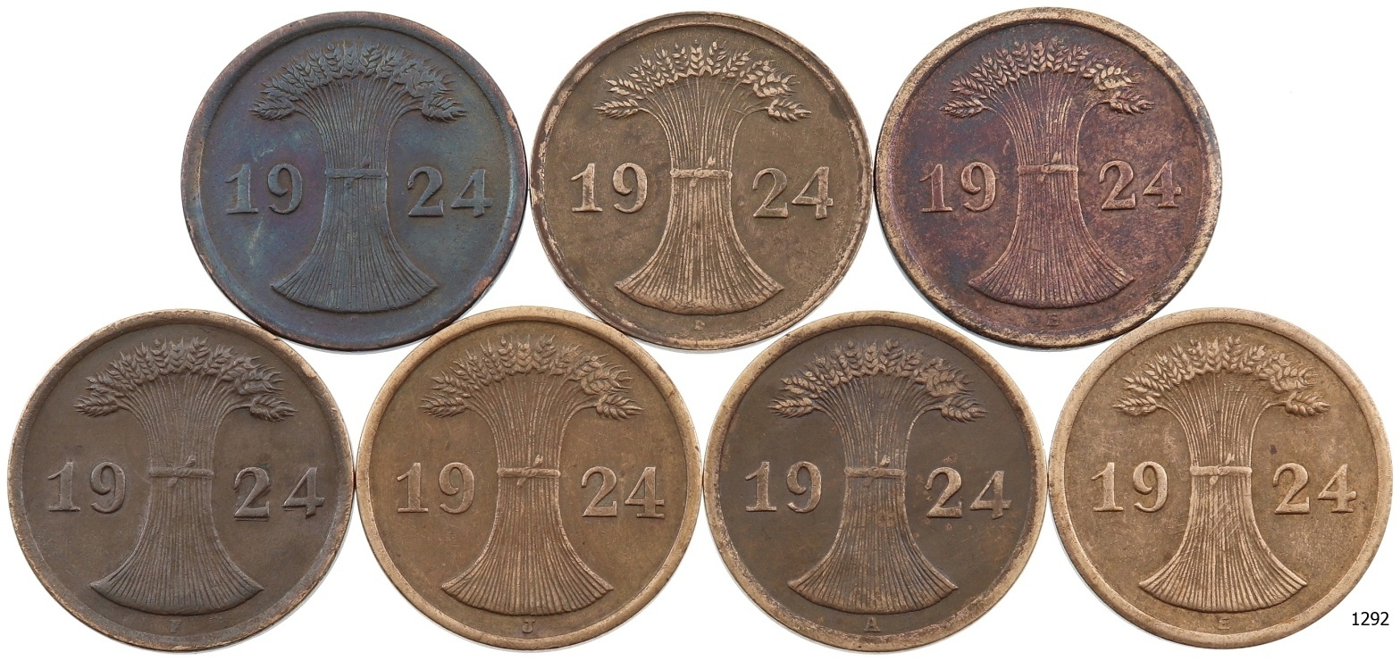 Lot 7 ks 2 Renten pfennig 1924 A,D,E,F,J a 2 Reichs pfennig 1924 A,E, stav 1 až 1-