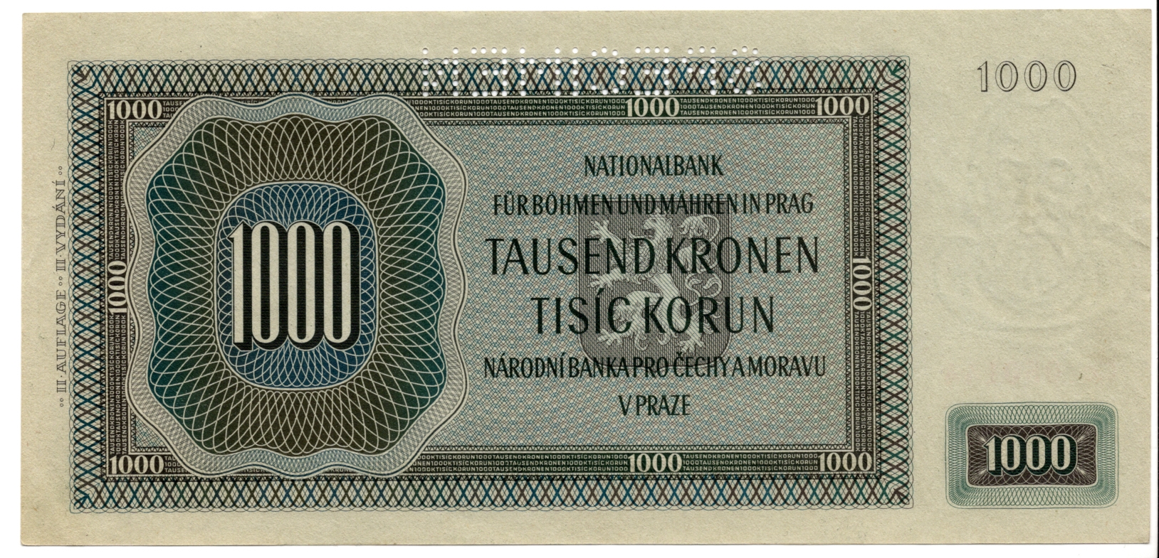 1000 Koruna 1942 (II. vydání), Cc, perforovaná, stav 0