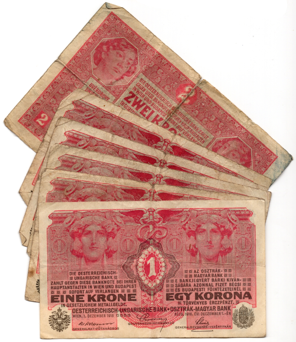 Lot 6 ks bankovek 1 a 2 koruna 1916-1917, stav -2 až 3-