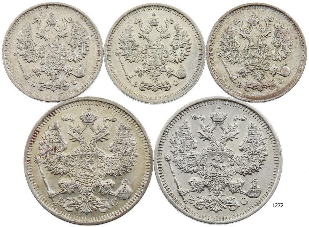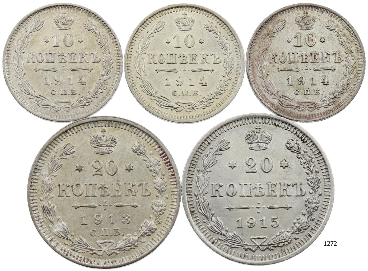 Lot 5 ks AR mincí, 10 a 20 kopějka 1913 – 1914, stav 1