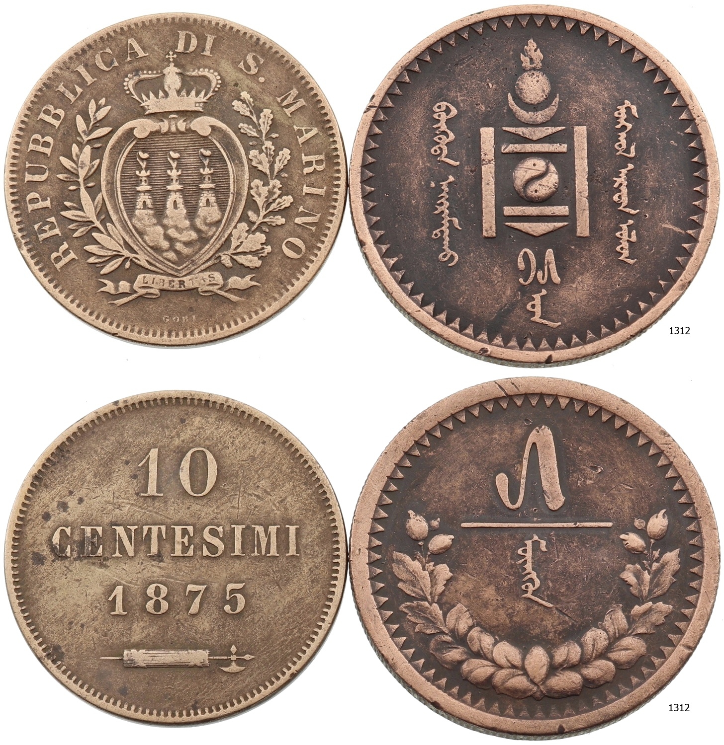 Lot 2 ks mincí 10 Centesimi 1875 a 5 mongo 1925, stav 2