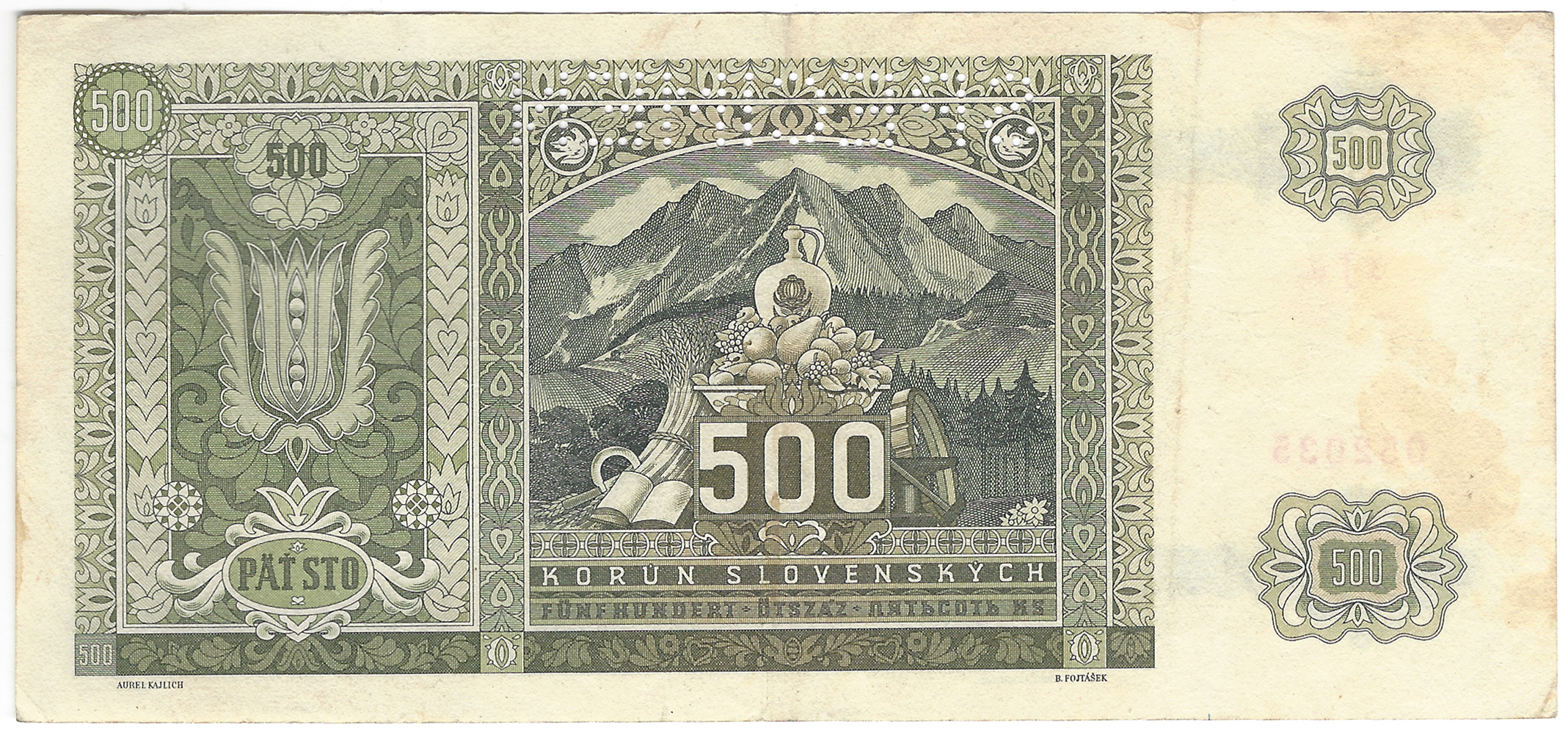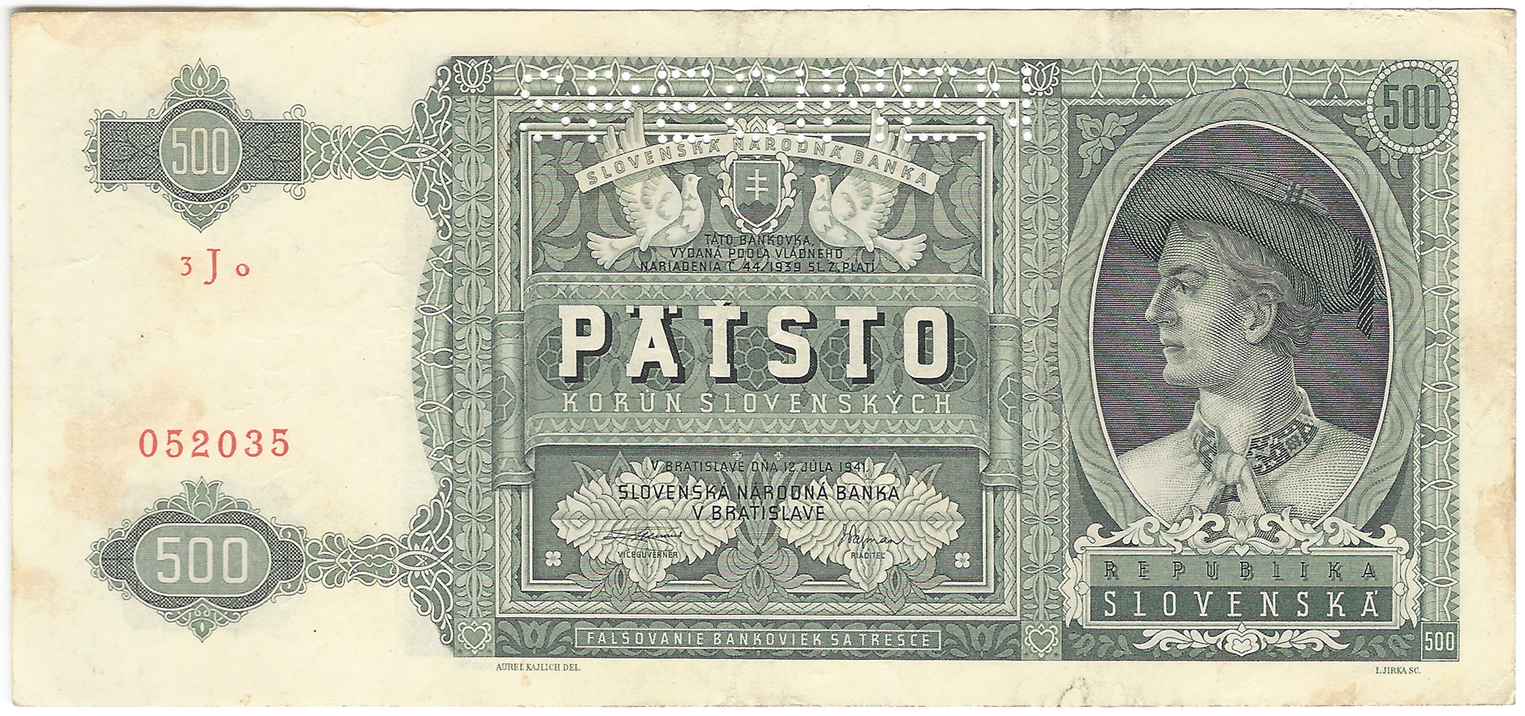 500 Koruna 1941, s. 3Jo, perforovaná, stav 2