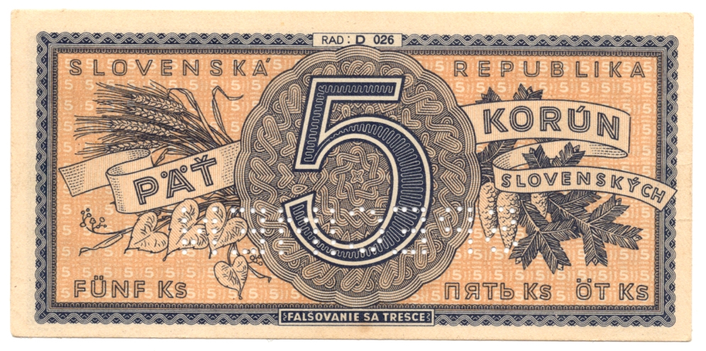 5 Koruna 1945, s.D026, perforovaná SPECIMEN dole, stav 0